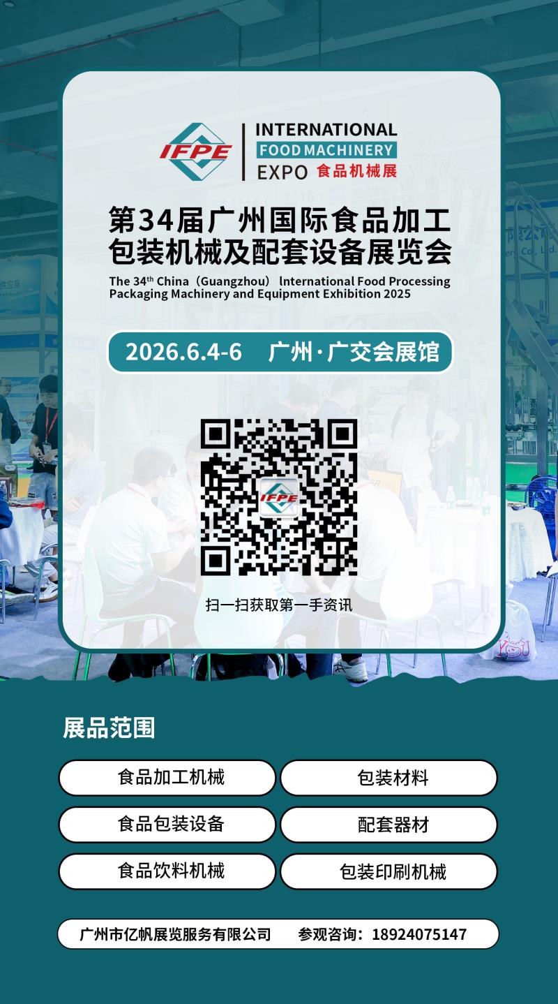 IFPE第34屆廣州國際食品加工包裝機械及配套設(shè)備展覽會將于2026年6月4-6日在廣交會館舉辦,歡迎您到來!