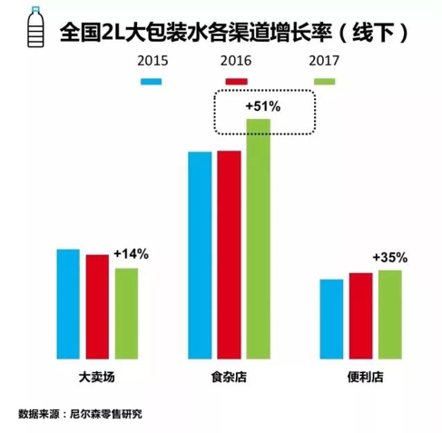 據(jù)尼爾森數(shù)據(jù),盡管400-800ml的包裝水仍然主導(dǎo)市場,但2L以上大包裝增速尤其亮眼。2017年食雜店的銷量增長率達(dá)到了51%。