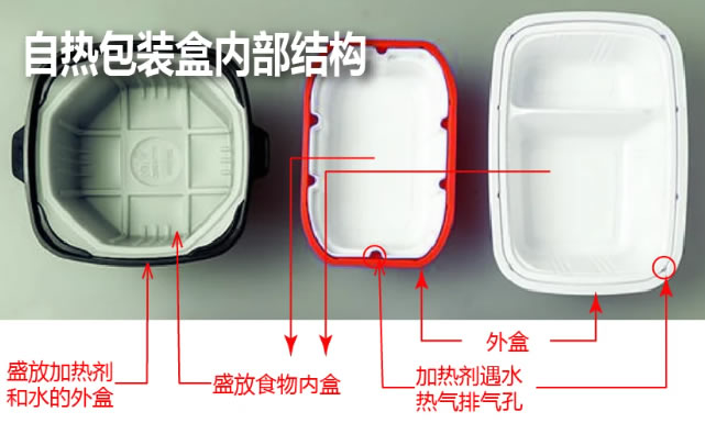 通過(guò)在發(fā)熱劑中加入水后的化學(xué)反應(yīng)發(fā)產(chǎn)生加溫,再將提前預(yù)熟的食材包里的食材和鍋底充分加熱的一種方便的加熱方式。