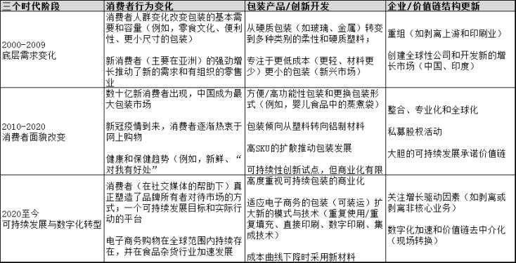 為了解未來的發(fā)展,我們回顧了包裝行業(yè)在過去幾十年的適應(yīng)情況。每個(gè)時(shí)代都以消費(fèi)者行為的巨大變化為特征,這些變化帶來了包裝產(chǎn)品和其他創(chuàng)新,最終導(dǎo)致了新的企業(yè)和價(jià)值鏈結(jié)構(gòu)。值得注意的是,隨著這三個(gè)時(shí)代的推進(jìn),數(shù)字設(shè)備和社交媒體的普及,加快了變革的步伐,并影響了顛覆的類型。