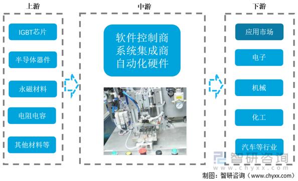 工業(yè)自動化是20世紀以來現(xiàn)代制造領(lǐng)域中最重要的核心技術(shù)和產(chǎn)業(yè)之一,其涉及電力、電子、計算機、人工智能、通訊、機電等諸多領(lǐng)域,需運用控制理論、儀器儀表、計算機信息技術(shù)等先進技術(shù),屬于綜合學(xué)科產(chǎn)業(yè),具有技術(shù)密集、高投入和高效益等顯著特征,是典型的高附加值產(chǎn)業(yè)。工業(yè)自動化的應(yīng)用可使工廠的生產(chǎn)和制造過程更加自動化、效率化、精確化,并具有可控性及可視性,從而達到增加產(chǎn)量、提高質(zhì)量、降低消耗、確保安全等目的。工業(yè)自動化就是工業(yè)生產(chǎn)中的各種參數(shù)為控制目的,實現(xiàn)各種過程控制,在整個工業(yè)生產(chǎn)中,盡量減少人力的操作,而使工業(yè)能進行自動生產(chǎn)。自動控制系統(tǒng)是實現(xiàn)自動化的主要手段,主要由控制器、被控對象、執(zhí)行機構(gòu)和變送器四個環(huán)節(jié)組成。工業(yè)自動化行業(yè)的原材料主要有電子元器件、機械件、非標加工件及其他產(chǎn)品。工業(yè)自動化行業(yè)產(chǎn)業(yè)鏈上游主要是自動化軟件、硬件制造商,主要包括可編程邏輯控制器(PLC)、伺服系統(tǒng)、步進系統(tǒng)、變頻器、人機界面(HMI)、傳感器、數(shù)據(jù)采集與監(jiān)視控制系統(tǒng)(SCADA)、制造執(zhí)行管理系統(tǒng)(MES)等工業(yè)自動化產(chǎn)品制造商;中游則是系統(tǒng)集成商和產(chǎn)品分銷商,即根據(jù)下游客戶的工藝需求,提供設(shè)備選型、產(chǎn)品銷售以及將標準化產(chǎn)品集成為可用的自動化控制系統(tǒng)等服務(wù)的提供商;下游則是制造裝備制造商和自動化工廠投資方,包括機床、電子制造設(shè)備、機械等領(lǐng)域。