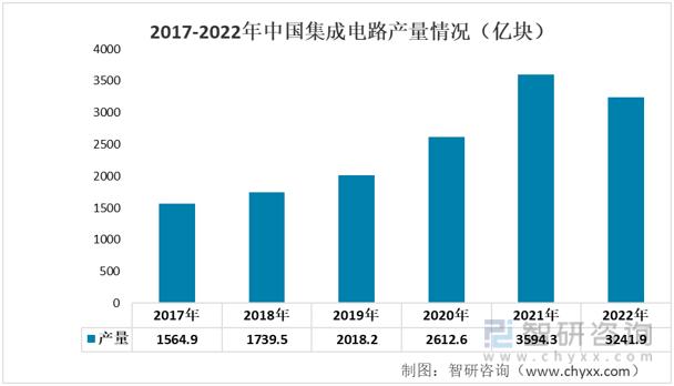集成電路在消費電子、高端制造、網(wǎng)絡(luò)通訊、家用電器、物聯(lián)網(wǎng)等諸多領(lǐng)域得到廣泛應(yīng)用,已成為衡量一個國家產(chǎn)業(yè)競爭力和綜合國力的重要標志之一,也是工業(yè)自動化行業(yè)上游重要的原材料。從近年來我國集成電路的產(chǎn)量情況來看,呈現(xiàn)上升的態(tài)勢,集成電路從2017年的1564.9億塊上升至2022年的3241.9億塊。
