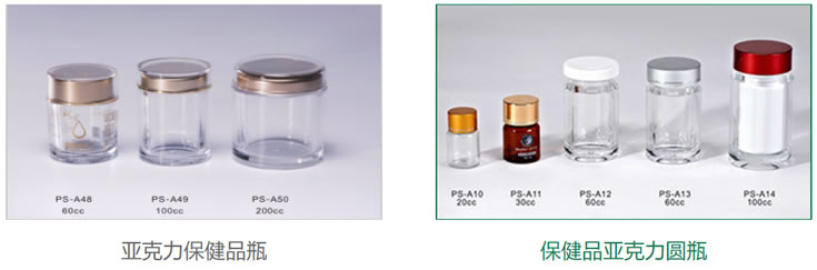 亞克力瓶透光率達92%以上,抗老化性能好。瓶子種類繁多,品相高端大氣,廣泛應用于保健品和化妝品包裝等。