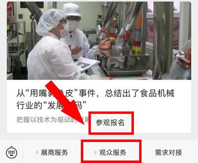 方法三:關注微信公眾號“IFPE食機展”,點擊下方菜單欄“觀眾服務”--“參觀報名”即可進入報名系統(tǒng)。