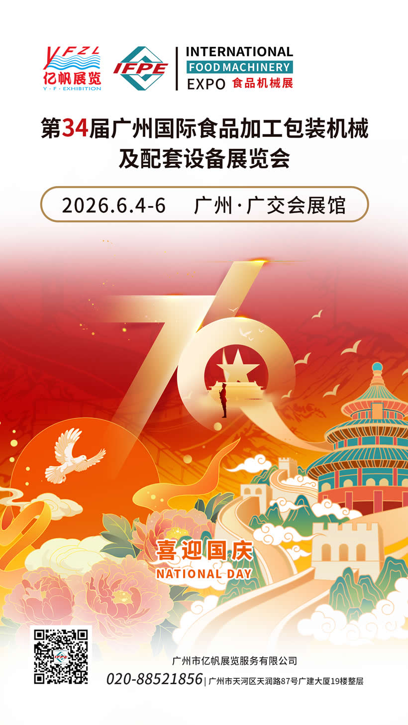 第34屆廣州國際食品加工包裝機(jī)械及配套設(shè)備展覽會(IFPE)將于2026年6月4-6日在廣州?廣交會展館舉行,IFPE食機(jī)展會由廣州市億帆展覽服務(wù)有限公司主辦,經(jīng)過多年的積淀與發(fā)展,已成為一個(gè)集食品生產(chǎn)、加工、包裝、食品招商全產(chǎn)業(yè)鏈于一體的行業(yè)品牌盛會。IFPE食機(jī)展與廣州國際大健康產(chǎn)業(yè)博覽會(IHE China大健康展)同期舉辦,將聯(lián)手為業(yè)內(nèi)人士搭建一個(gè)技術(shù)交流、促進(jìn)合作、擴(kuò)大上下游貿(mào)易、提高品牌和企業(yè)知名度的高品質(zhì)商貿(mào)平臺。