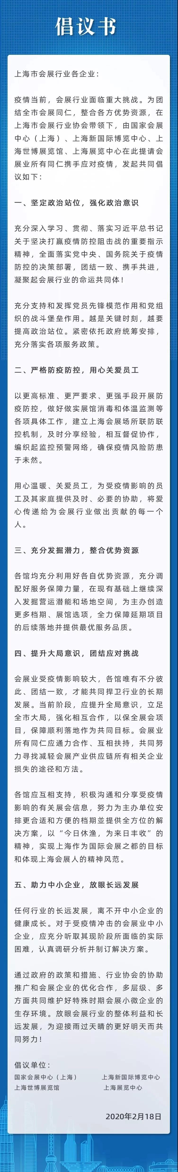 與此同時,一份由國家會展中心(上海)提議、上海展覽業(yè)協(xié)會指導,上海新國際博覽中心、世博展覽館、上海國際展覽中心昨天共同發(fā)起的倡議書,也向社會公開發(fā)布?!冻h書》明確“不讓任何一個受延期影響的展覽會因沒有檔期和場地而取消”。