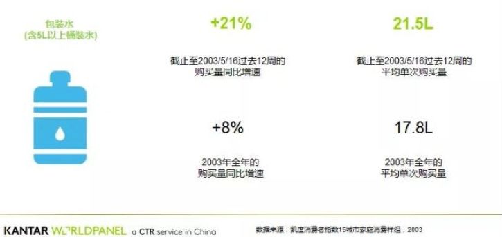 事實上,在2003年SARS期間,包裝水的銷量也在攀升。凱度消費者指數(shù)的分析揭示,2003年SARS感染高發(fā)期間,包裝水需求量凸起,尤其在北京,由于許多家庭紛紛在此期間進(jìn)行大量囤貨,包裝水的購買量在2003年3-5月間增長了21%。