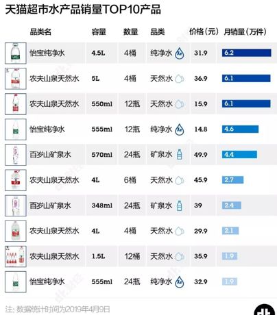 線下增速迅猛,線上更是成為消費主流。在天貓月銷量前10的水大體分為兩類,一類是4L左右的大桶裝,一類是小瓶礦泉水。其中,大桶裝水占據(jù)熱銷半數(shù),而銷量領(lǐng)先的兩個產(chǎn)品都是4.5L以上的大桶水。