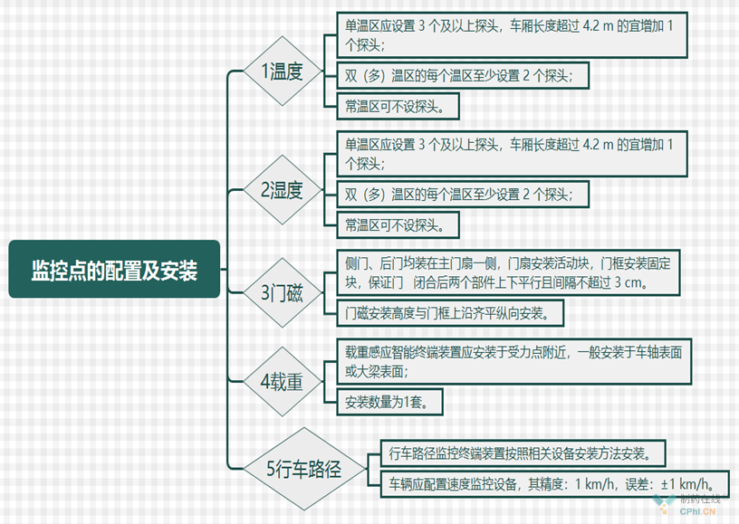 2) 規(guī)范了監(jiān)控點的配置及安裝,包括溫度、溫濕度探頭安裝位置和數(shù)量、門磁、載重感應智能終端裝置以及行車路徑監(jiān)控終端裝置的配置及安裝。