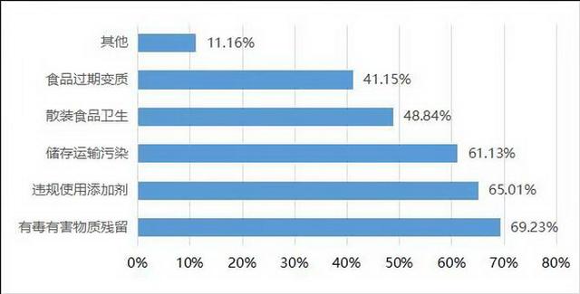 消費者最擔心哪些食品安全問題?調(diào)查結(jié)果顯示,受訪者最擔心的食品安全問題是有毒有害物質(zhì)殘留,其次是違規(guī)使用添加劑,二者占比分別為69.23%和65.01%。另有61.13%的受訪者最擔心儲存運輸污染,48.84%受訪者最擔心散裝食品衛(wèi)生問題,還有41.15%的受訪者表示最擔心食品變質(zhì)過期。