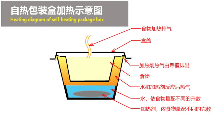 通過(guò)在發(fā)熱劑中加入水后的化學(xué)反應(yīng)發(fā)產(chǎn)生加溫,再將提前預(yù)熟的食材包里的食材和鍋底充分加熱的一種方便的加熱方式。