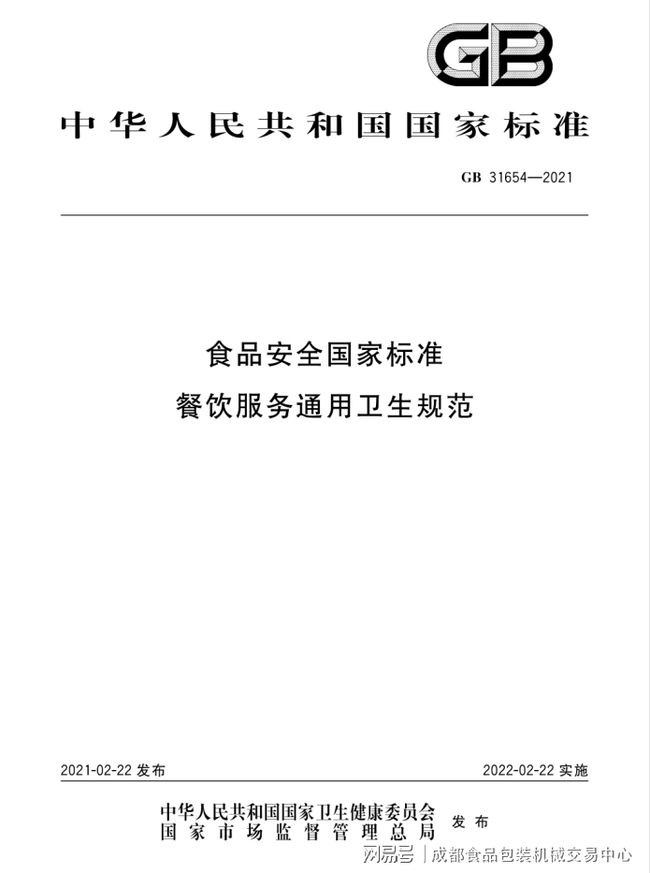2021年2月22日國家發(fā)布《GB 31654-2021 食品安全國家標(biāo)準(zhǔn) 餐飲服務(wù)通用衛(wèi)生規(guī)范》,本標(biāo)準(zhǔn)規(guī)定了餐飲服務(wù)活動中食品采購、貯存、加工、供應(yīng)、配送和餐(飲)具、食品容器及工具清洗、消毒等環(huán)節(jié)場所、設(shè)施、設(shè)備、人員的食品安全基本要求和管理準(zhǔn)則,其適用于餐飲服務(wù)經(jīng)營者和集中用餐單位的食堂從事的各類餐飲服務(wù)活動,如有必要制定某類餐飲服務(wù)活動的專項衛(wèi)生規(guī)范,應(yīng)當(dāng)以本標(biāo)準(zhǔn)作為基礎(chǔ)。