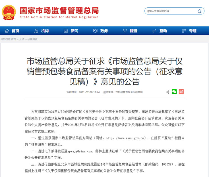 7月28日,市場(chǎng)監(jiān)管總局發(fā)布《關(guān)于僅銷(xiāo)售預(yù)包裝食品備案有關(guān)事項(xiàng)的公告(征求意見(jiàn)稿)》,擬對(duì)僅銷(xiāo)售預(yù)包裝食品的食品經(jīng)營(yíng)者備案有關(guān)事項(xiàng)進(jìn)行統(tǒng)一規(guī)范。