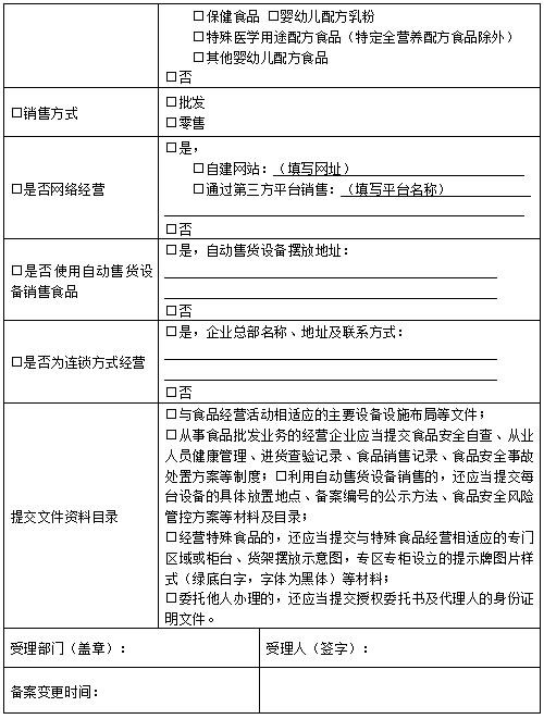 二、從事僅銷(xiāo)售預(yù)包裝食品活動(dòng)的食品經(jīng)營(yíng)者應(yīng)當(dāng)具備與銷(xiāo)售的食品品種、數(shù)量等相適應(yīng)的經(jīng)營(yíng)條件。備案時(shí),食品經(jīng)營(yíng)者應(yīng)當(dāng)填寫(xiě)《僅銷(xiāo)售預(yù)包裝食品備案信息采集表》,并提交相關(guān)文件資料及目錄。備案信息發(fā)生變化的,應(yīng)當(dāng)自發(fā)生變化之日起15個(gè)工作日內(nèi)向原實(shí)施備案的市場(chǎng)監(jiān)管部門(mén)提交《僅銷(xiāo)售預(yù)包裝食品備案信息變更表》、與變更項(xiàng)目有關(guān)的文件資料和目錄進(jìn)行備案變更。終止食品經(jīng)營(yíng)活動(dòng)的,應(yīng)當(dāng)自經(jīng)營(yíng)活動(dòng)終止之日起15個(gè)工作日內(nèi),向原備案的市場(chǎng)監(jiān)管部門(mén)注銷(xiāo)備案。未及時(shí)注銷(xiāo)備案的,市場(chǎng)監(jiān)管部門(mén)可注銷(xiāo)備案。食品經(jīng)營(yíng)者主體資格依法終止的,備案自動(dòng)失效。