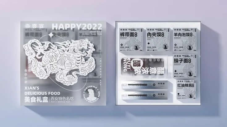 銀灰色的禮盒營(yíng)造出高級(jí)質(zhì)感,封面排版采用不同類型的字體設(shè)計(jì)來(lái)區(qū)分產(chǎn)品信息。版面還結(jié)合了傳統(tǒng)剪紙,給每款面食都搭配有相應(yīng)的瑞獸形象,刺激人們對(duì)產(chǎn)品的味覺聯(lián)想。