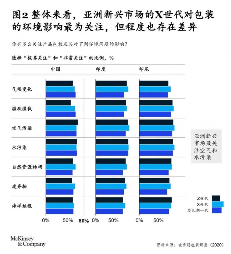 當(dāng)深入研究第二個問題,探究是哪個群體在助推這些擔(dān)憂時,我們發(fā)現(xiàn)所有受訪年齡群體都很關(guān)注這些問題。整體來看,X世代的關(guān)注程度最高,其次是Z世代/千禧一代和嬰兒潮一代(見圖2)。具體到空氣和水污染這兩個主要領(lǐng)域,印尼的X世代對此尤其關(guān)注,而中國和印度的情況差異較大。