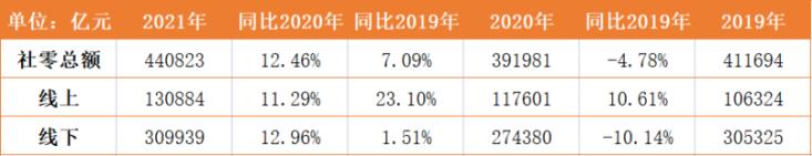線上、線下方面,2021年線上消費額較2020年增速同比提升11.29%,較2019年大增23.1%,可見隨著疫情的爆發(fā)及常態(tài)化趨勢,線上消費習慣進一步普及與深化;但線下消費則不太樂觀,2021年相較2019年僅微增1.51%,基本持平。