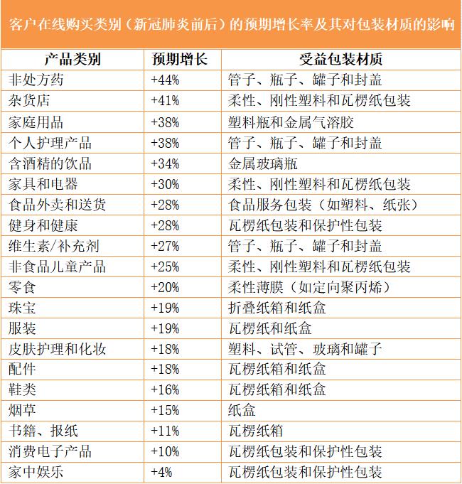 預計幾乎所有消費品類別都將實現(xiàn)線上購買的持續(xù)增長,特別是非處方藥、日用商品、家庭用品和個人護理產(chǎn)品。下圖顯示了麥肯錫和Mesirow基于美國消費者的數(shù)據(jù),這些包裝形式有望受益最大,包括瓦楞運輸紙箱、其他形式的保護性包裝、柔性薄膜、硬質(zhì)容器、塑料瓶和塑料管、金屬氣霧罐和罐子。