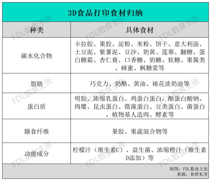 目前,3D食品打印所用到的食材可以從組成成分的角度,大致歸納為五大類:碳水化合物、脂肪、蛋白質(zhì)、膳食纖維以及功能成分,F(xiàn)DL數(shù)食主張選取了以下海內(nèi)外代表性案例展開介紹:
