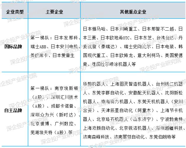 我國(guó)工業(yè)機(jī)器人本體的主要企業(yè)梯隊(duì)如下表所示。