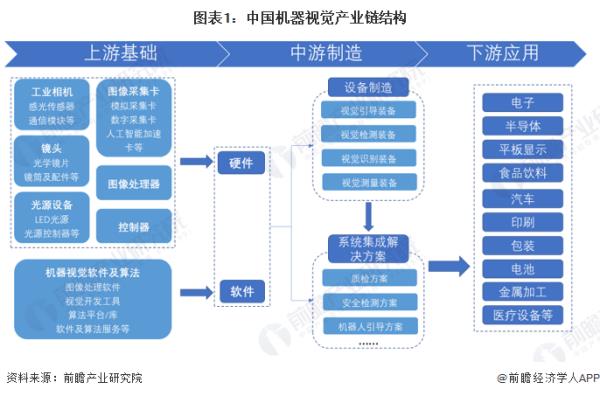 機器視覺行業(yè)的上游有光源、鏡頭、工業(yè)相機、圖像采集卡、機器視覺軟件等的提供商。行業(yè)下游應(yīng)用較廣,主要下游市場是半導(dǎo)體和電子制造行業(yè)。除此之外還有應(yīng)用到汽車、印刷包裝、農(nóng)業(yè)、醫(yī)療設(shè)備和金屬加工等領(lǐng)域。