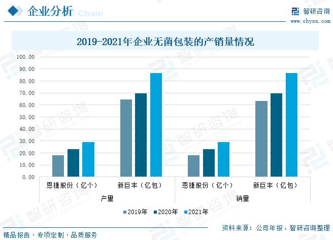 從企業(yè)產(chǎn)銷量的情況來看,新巨豐的產(chǎn)銷量明顯大于恩捷股份。在2019-2021年兩家企業(yè)的無菌包裝的產(chǎn)銷量保持持續(xù)上升的的狀態(tài),2021年恩捷股份的產(chǎn)量達(dá)到28.90億個(gè),銷量達(dá)到28.98億個(gè);新巨豐的產(chǎn)量達(dá)到86.71億包,銷量為86.74億包。