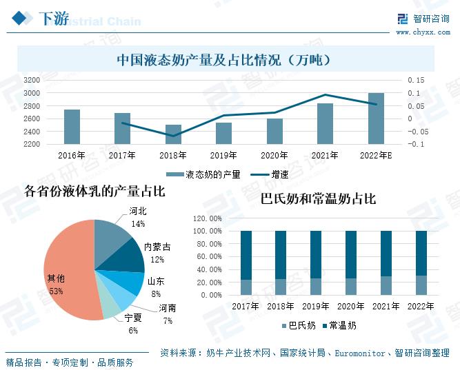 液態(tài)奶是無菌包裝的主要應(yīng)用市場(chǎng)。在我國(guó)液態(tài)奶的市場(chǎng)中主要以常溫奶為主,據(jù)統(tǒng)計(jì),在2017-2022年,中國(guó)常溫奶的占比均大于巴氏奶。常溫奶一般包裝的儲(chǔ)存時(shí)間不超過30天,而無菌包裝能夠大幅度提升常溫奶的保質(zhì)期,加之由于我國(guó)液體乳主要分布在北方,南方市場(chǎng)需求量較大,國(guó)內(nèi)原奶產(chǎn)銷地域分布失衡,大部分地區(qū)冷鏈物流系統(tǒng)尚不發(fā)達(dá)且運(yùn)輸距離過長(zhǎng),對(duì)于更長(zhǎng)時(shí)間的保質(zhì)期有著較大的需求,進(jìn)而對(duì)無菌包裝的需求量大。根據(jù)國(guó)家奶牛產(chǎn)業(yè)技術(shù)網(wǎng)數(shù)據(jù),在2016-2018年,我國(guó)液態(tài)奶的產(chǎn)量逐年下降,但在此之后,液態(tài)奶的產(chǎn)量逐年上升,到2021年中國(guó)液態(tài)奶的產(chǎn)量達(dá)到了2843萬噸,同比上漲9.37%,預(yù)計(jì)2022年液態(tài)奶的產(chǎn)量將達(dá)到3000萬噸。隨著液態(tài)奶產(chǎn)量的不斷增長(zhǎng),無菌包裝市場(chǎng)需求量猛增。